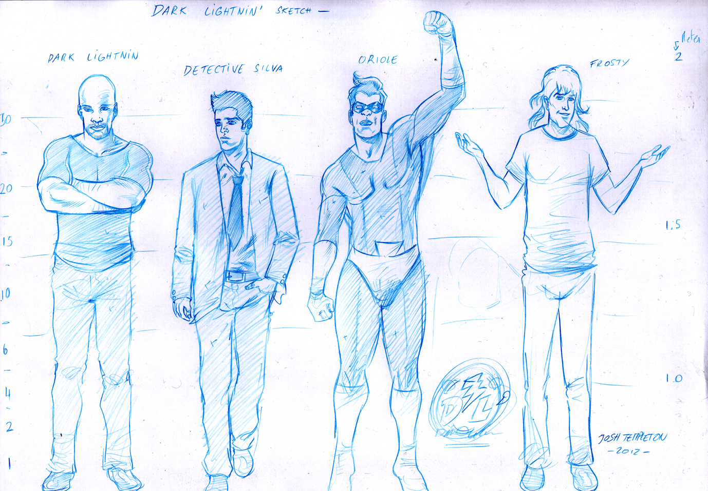 I understand that life gets into the way of making comics, and I think that is what happened to the second try of Dark Lightnin'. The artist, Josh Templeton, has a family, and does other comic book work such as inks and colors, so he doesn't have that much free time to collaborating on a project. With that said, he said he was willing to get things going with Dark Lightnin and he seemed very excited. Within a few hours of sending the synopsis and previous character designs, he sent the character designs that you see above to me. I told him, lets do this!